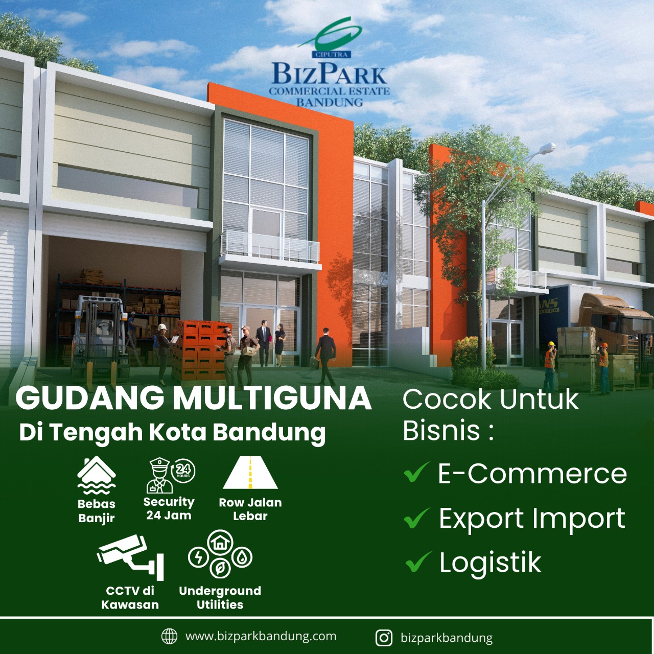 Bizpark Bandung terletak di pusat kota Bandung, menyediakan gudang siap pakai dengan ukuran 12 dan kavling siap bangun dengan ukuran 260 hingga 900 meter. Gudang multiguna yang cocok untuk berbagai usaha logistik, export impor, e-commerce dengan fasilitas yang lengkap cocok untuk mendukung usaha Anda.